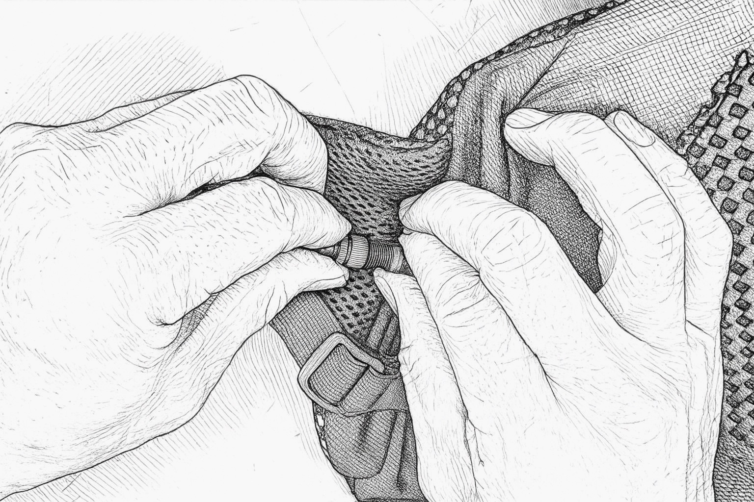 將繩子套入汽車椅的頭枕,再將橡膠固定管塞入汽車椅與椅背之間固定坐墊及腰椎支撐墊,利用繩索扣調整繩子使整腰椎支撐位置適合個人的支撐位置,將繩子打個蝴蝶結,以防止腰椎支撐因擠壓而造成的位置移動。