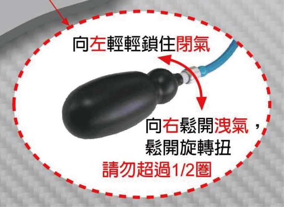洩氣時只需將充氣球的旋轉鈕向右鬆開即可洩氣,當洩氣至所需的壓力及高度時,再將旋轉鈕向左輕輕鎖固即可停止洩氣。