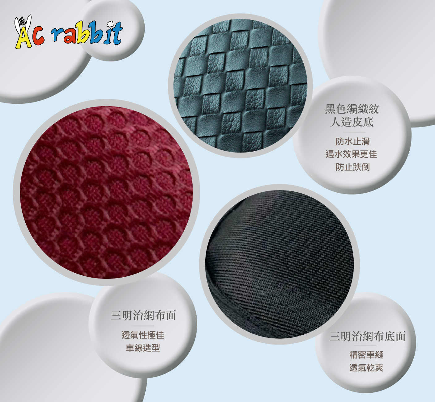 大網布黑色(-Bbk)/ 藍色(-Bbu)/紅色(-Brd),黑色 TC 布貼合泡綿面裡,車單針造型線。